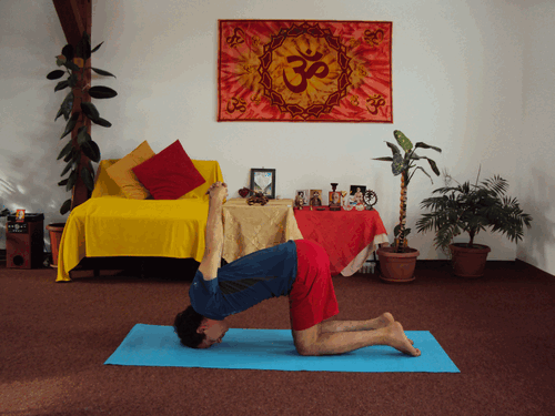 Aşezaţi apoi la sol fruntea (zona de graniţă dintre frunte şi păr) cât mai aproape de genunchi şi prindeţi mâinile brăţară în spate. Ridicaţi apoi cât mai mult mâinile în sus (palmele fiind în această poziţie orientate către în jos) şi spre în faţă. Braţele rămân întinse în această poziţie. Bazinul rămâne ridicat cât mai sus iar trunchiul se curbează menţinându-l cât mai relaxat. Se revine apoi la poziţia de pornire pentru a realiza conştientizarea.