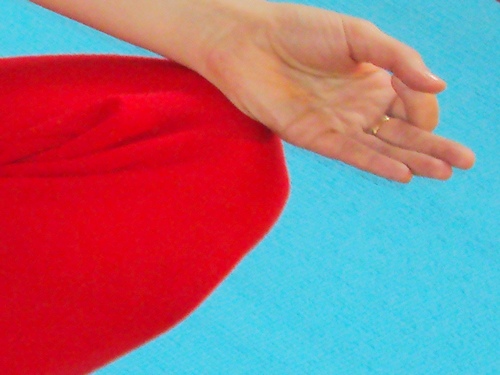 Mâinile se așează pe genunchi cu palmele în sus, iar degetele realizează faimoasa Jnana Mudra care constă în a plasa vârful degetului arătător în dreptul primei falange (dinspre vârf) a degetului mare astfel încât aceste două degete să descrie aproximativ un cerc. Celelalte trei degete sunt întinse și relaxate.