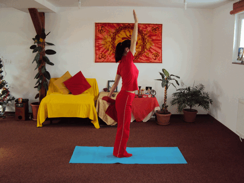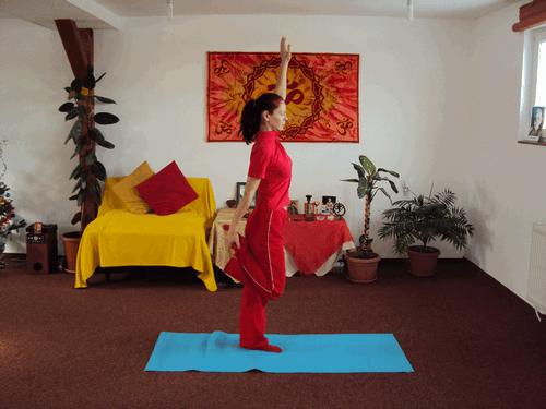 Se realizează în acelaşi mod descris mai sus, însă de această dată mâna dreaptă prinde glezna piciorului drept şi braţul stâng se ridică în sus.