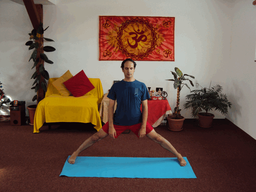 Poziţia de pornire este în picioare cu tălpile depărtate cât mai mult între ele şi paralele. Este important să depărtăm cât mai mult picioarele între ele astfel încât să ne fie apoi mai uşor să ajungem cu capul la sol.