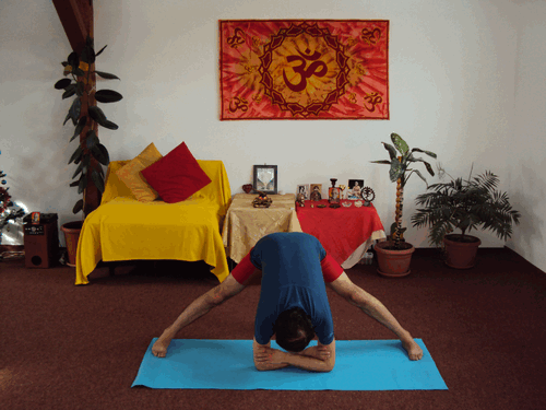 Prasārita Padatanāsana combină avantajele unei posturi de flexie înainte cu acelea ale unei posturi inversate datorită sprijinului care se realizează pe frunte.