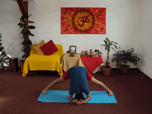 Ne aplecăm în faţă urmărind să aşezăm la sol fruntea cât mai aproape de linia imaginară care uneşte cele două tălpi. Pentru a sprijini capul să nu alunece în faţă şi pentru a prelua o parte din greutatea corpului, vom realiza cu mâinile un triunghi echilateral plasând fruntea pe sol în căuşul format de mâinile prinse brăţară. Astfel fruntea şi cele două coate vor închipui vârfurile unui triunghi echilateral. Pentru realizarea acestui triunghi vom plasa zona dintre arătător şi degetul mare pe braţul mâinii opuse (în aşa numita poziţie a “braţelor încrucişate”).