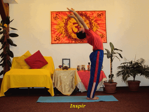 Imediat după contracţia din finalul expiraţiei de la prima fază, vă relaxaţi şi întindeţi braţele către în sus după care vă arcuiţi pe spate ca în cazul poziţiei ardha candrāsana. Ridicarea braţelor şi arcuirea spre spate se face în timpul inspirației şi este o mişcare fluidă, fără sacadări sau pauze. Ca şi în cazul posturii semilunii, va trebui să împingeţi puţin bazinul în faţă şi să vă arcuiţi începând cu partea de sus a coloanei vertebrale.