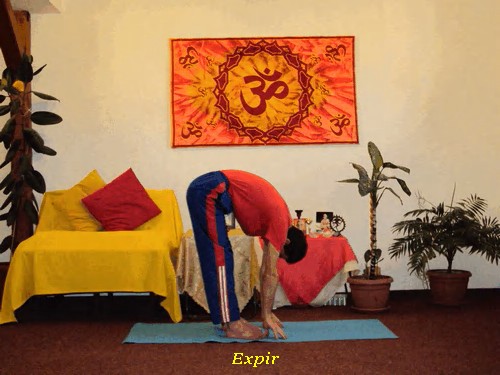 Când aţi atins maximul extensiei spre spate şi sfârşitul inspiraţiei, începeţi să expiraţi menţinând braţele întinse către în sus şi vă aplecaţi odată cu expiraţia către în faţă pentru a ajunge în final în postura numită pādahastāsana. În cazul acestei mişcări este bine să vă aplecaţi mai întâi din încheietura bazinului fără a curba trunchiul şi abia când aţi atins maximul posibilităţii de flexie înainte din această încheietură curbaţi trunchiul, urmărind să apropiaţi cât mai mult capul de genunchi şi să atingeţi pe cât posibil solul cu mâinile fără a îndoi genunchii. Tot în această fază ultimă a aplecării către în faţă, presaţi cât mai bine bărbia în piept. Toată această mişcare de aplecare către în faţă se face pe expiraţie astfel încât la capătul acesteia să vă aflaţi în pādahastāsana, dacă se poate cu palmele pe sol de o parte şi de alta a tălpilor.