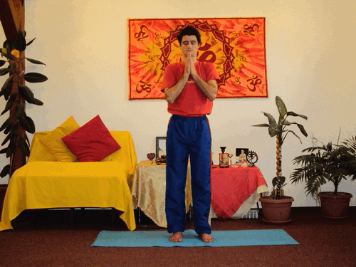 Prima poziţie este numită Prārthanāsana (postura rugăciunii – în sanscrită prārtanā înseamnă atât rugăciune cât şi a adresa o cerere) sau praṅāmāsana (înseamnă tot postura pentru rugăciune) şi implică să împreunaţi palmele în dreptul pieptului, cu degetele mari sprijinindu-se în scobitura gâtului (pe capătul sternului) şi formând un unghi aproape drept cu restul degetelor. Corpul este drept, tălpile paralele şi destul de apropiate la o distanţă de aproximativ o palmă una de alta.