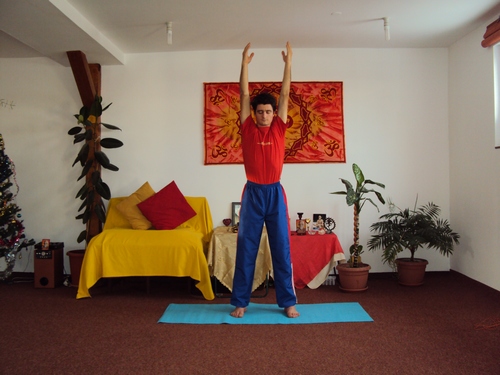 Stați în picioare, cu tălpile paralele, dar puțin depărtate. Ridicați brațele pe lîngă urechi și le întindeți, paralele, în sus, cât mai mult cu putință. În final, întregul corp, brațele, trunchiul, picioarele trebuie să fie cât mai bine întinse, într-un elan interior vertical, către în sus. Rămân relaxate doar palmele și degetele. Aplicați aśvinī mudrā – contracția sfincterelor anale și a zonei anusului în general. Mențineți continuă această contracție pe întreaga durată a executării posturii. Respirați normal, de voie, fără să încordați abdomenul.