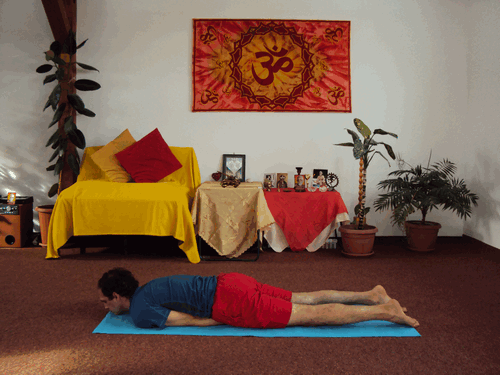 Poziția de plecare: culcat cu fața în jos, picioarele întinse, tălpile orientate în sus, ca la postura cobrei (bhujangasana).