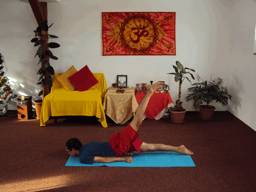 Ridicați lent, în plan vertical, piciorul drept, contractând progresiv musculatura dorsală inferioară, sprijinindu-vă mai ales pe brațul drept, greutatea piciorului transmițându-se în bună parte și asupra abdomenului, unde presiunea crește.